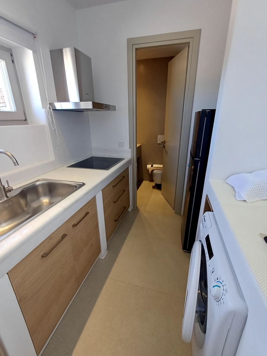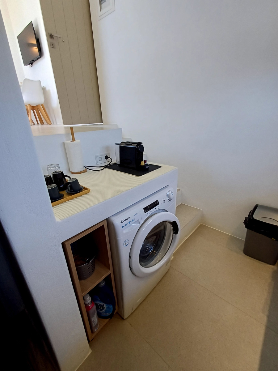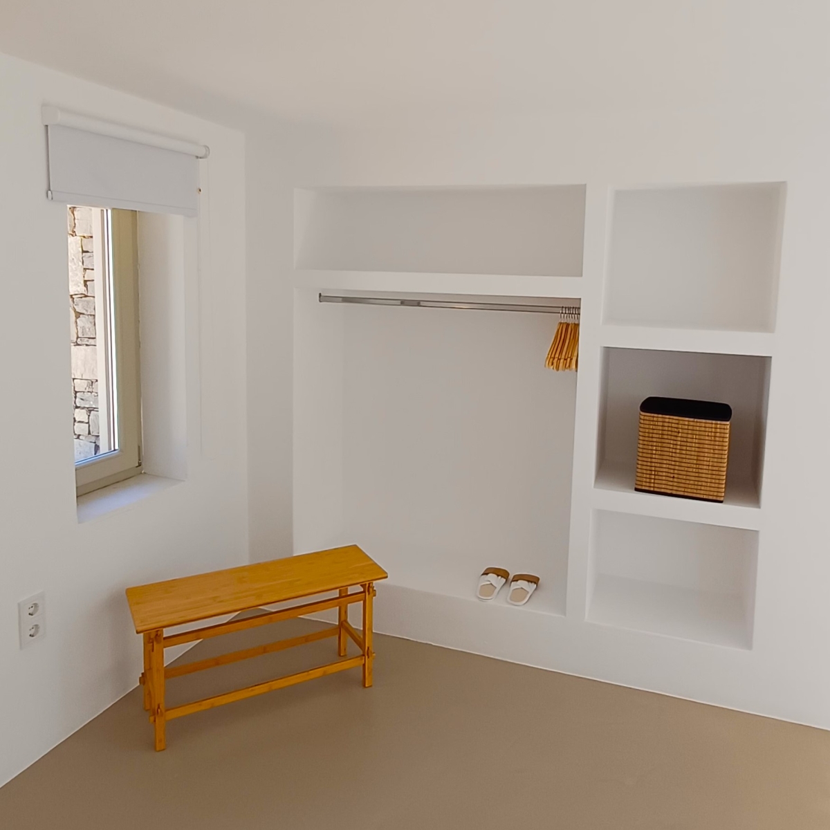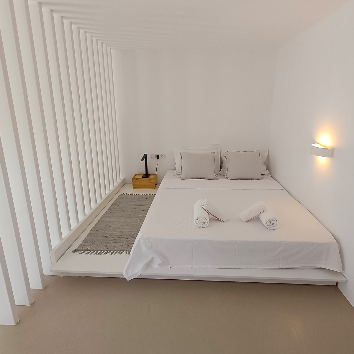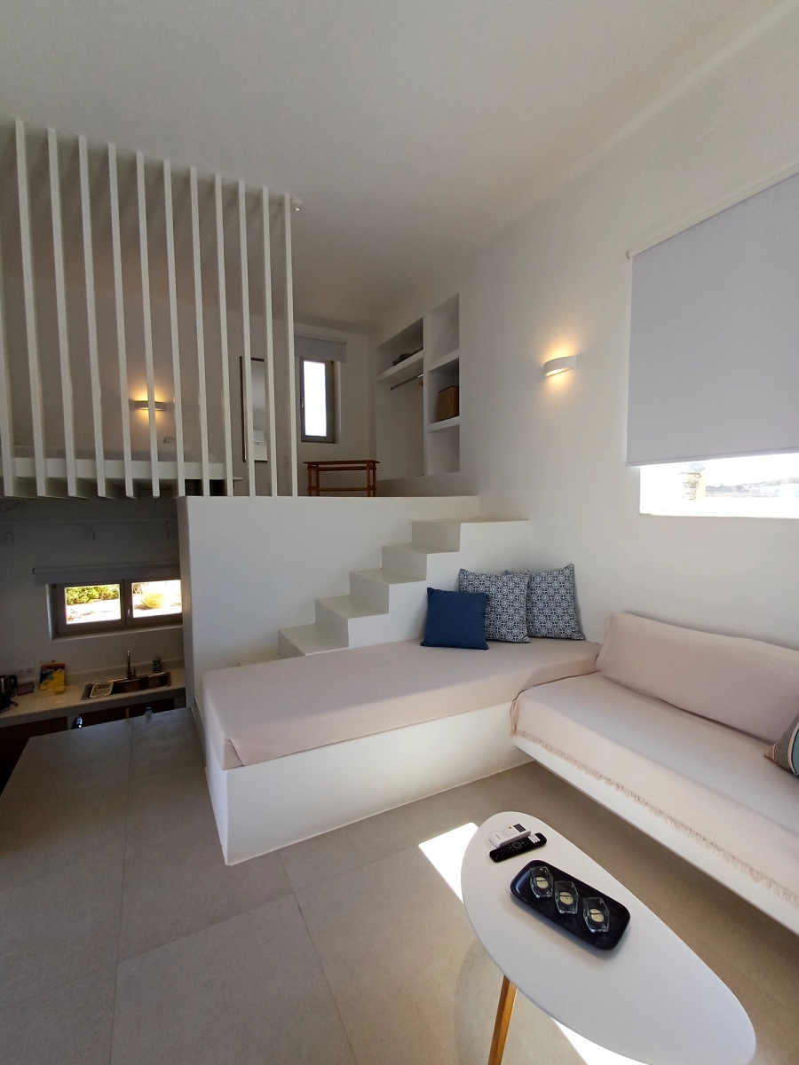 Un joli loft, qui est de 4,5m de haut avec une terrasse privée et vue sur la mer. Il a des meubles modernes et minimales. Le salon a des matelas anatomiques, une table à manger. Il y a aussi une cuisine. Dans le lit il y a unmatelas double anatomique, des linges de maison en percale de coton et en lin. Il y a une salle de douche spacieuse. Vous vous détendrez dans un espace très ensoleillé.